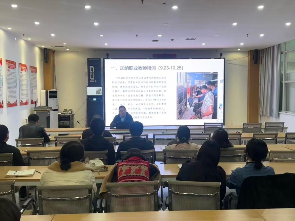 冷波刚完成为期两个月的赴加纳对外培训。他结合培训过程中的跨文化教学、技术标准适配、校企需求对接等实际案例,分享心得体会。他首先简要介绍加纳的地理位置、社会文化及职业教育发展现状,帮助在场教师全面了解培训背景。随后,他围绕核心工作分模块详细阐述成果:一是完成电子电工、机械加工领域当地教师培训,所有学员均通过考核。二是组织电工职业资格鉴定,同步搭建专属题库。三是联合中航国际与加纳库马西技术大学,成功挂牌“加纳职业教育研究中心”,输出专业标准与课程标准,推动中国职教标准落地非洲。此次加纳之行不仅实现了中国职业教育资源与标准的国际输出,更搭建了中非职教合作的沟通桥梁,为后续深化国际交流积累了宝贵经验。